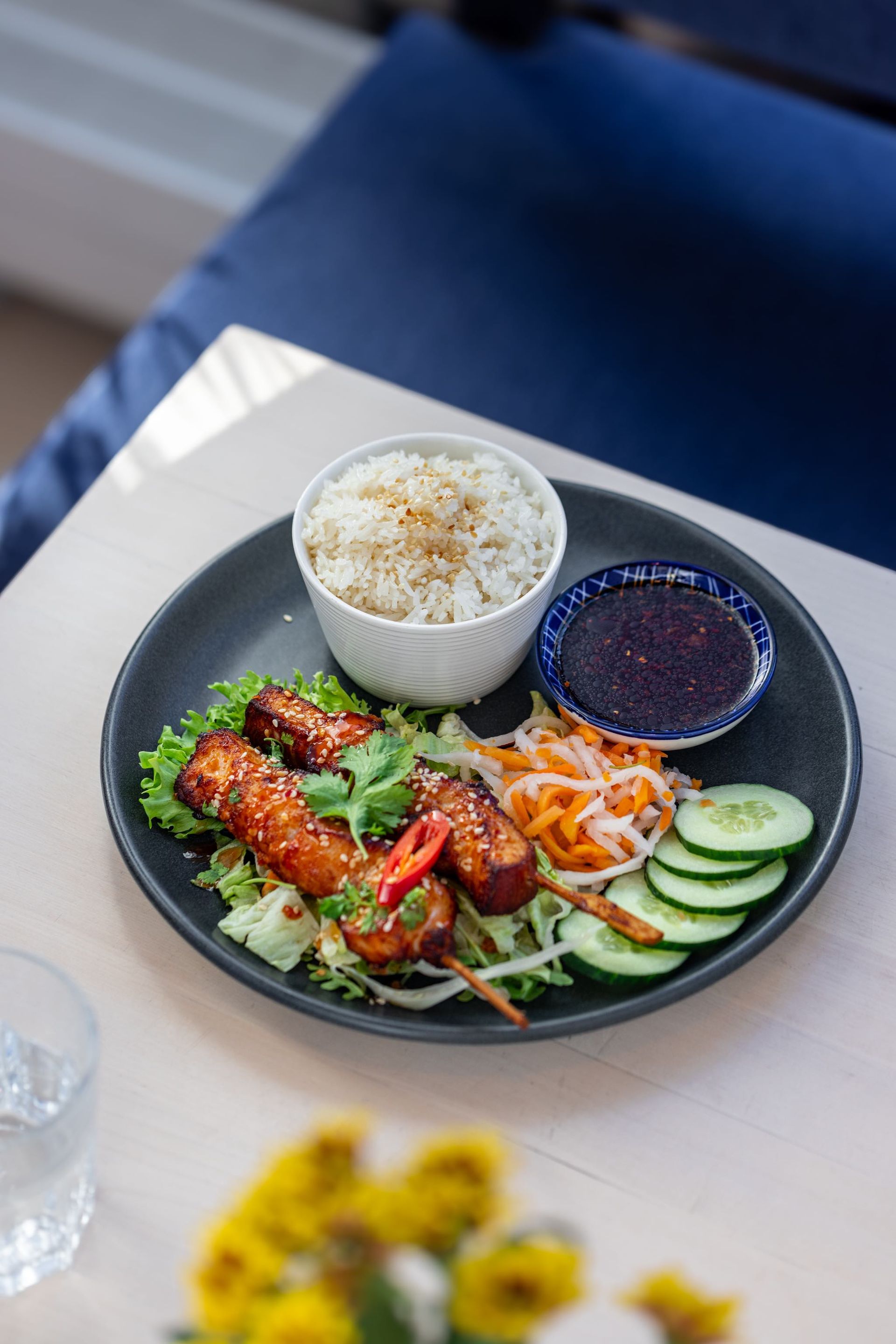 2pcs large chicken skewers grilled with lemongrass sauce, salad, pickles, home-made soy ginger sauce [G]
