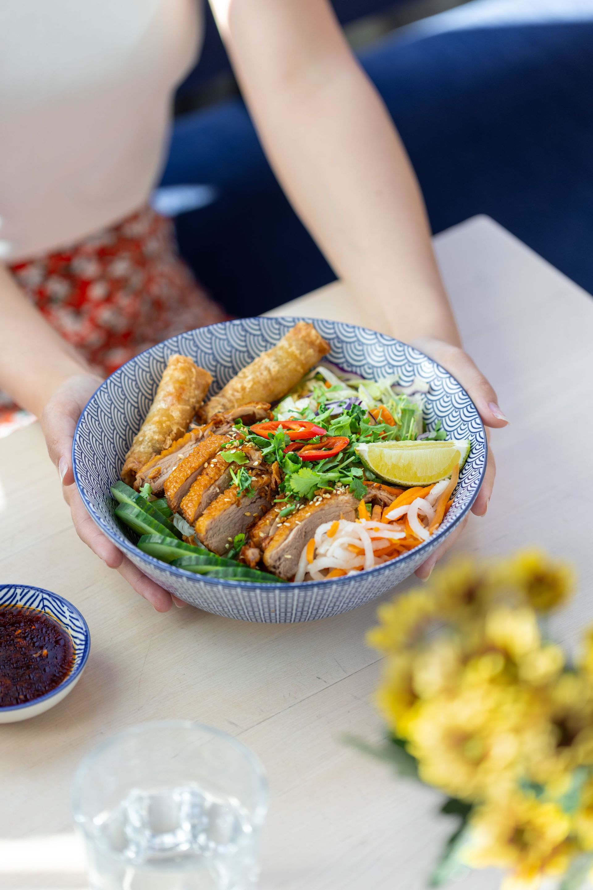 Lukewarm bowl Viet noodle, fresh veggies, herbs, pickles, fried onions